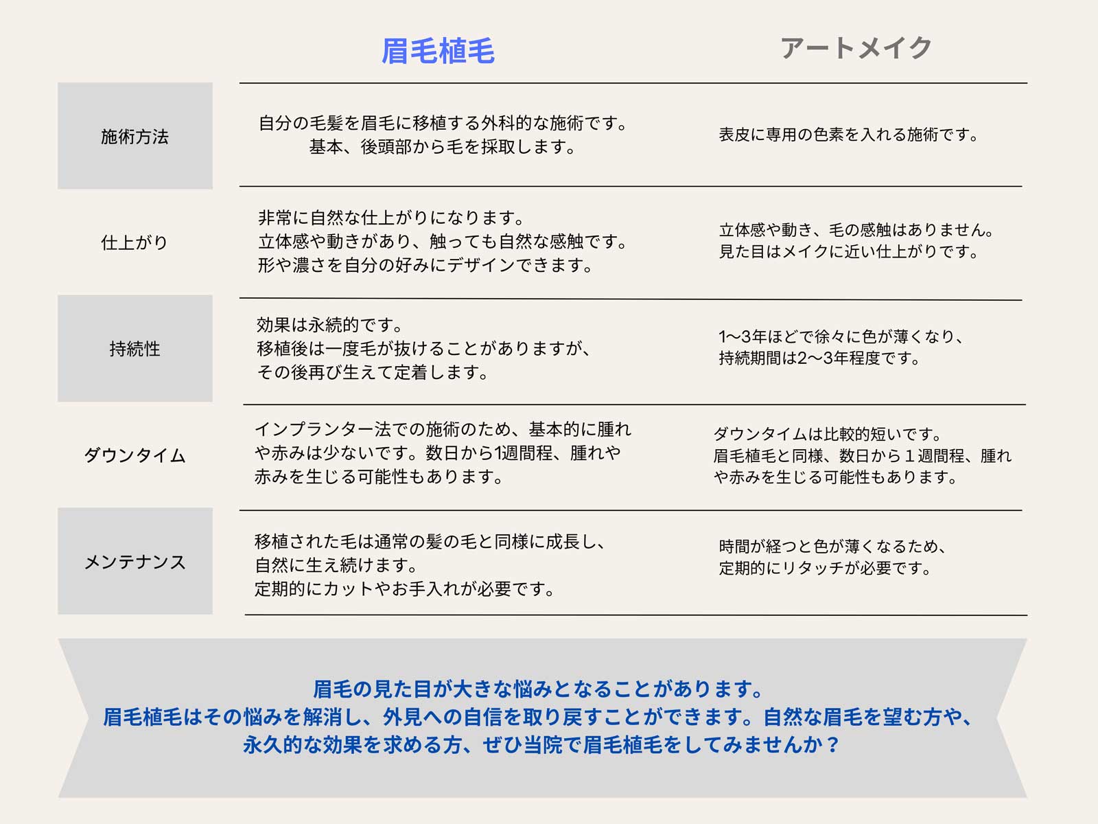 経験や技術を持った医師に手術を依頼することで、眉毛の自然な仕上がりや、眉毛のデザイン性、失敗のリスクを低減することができます。クリニックや医師の実績や患者様の声を確認することで、より安心して眉毛植毛の施術を受けることができます。