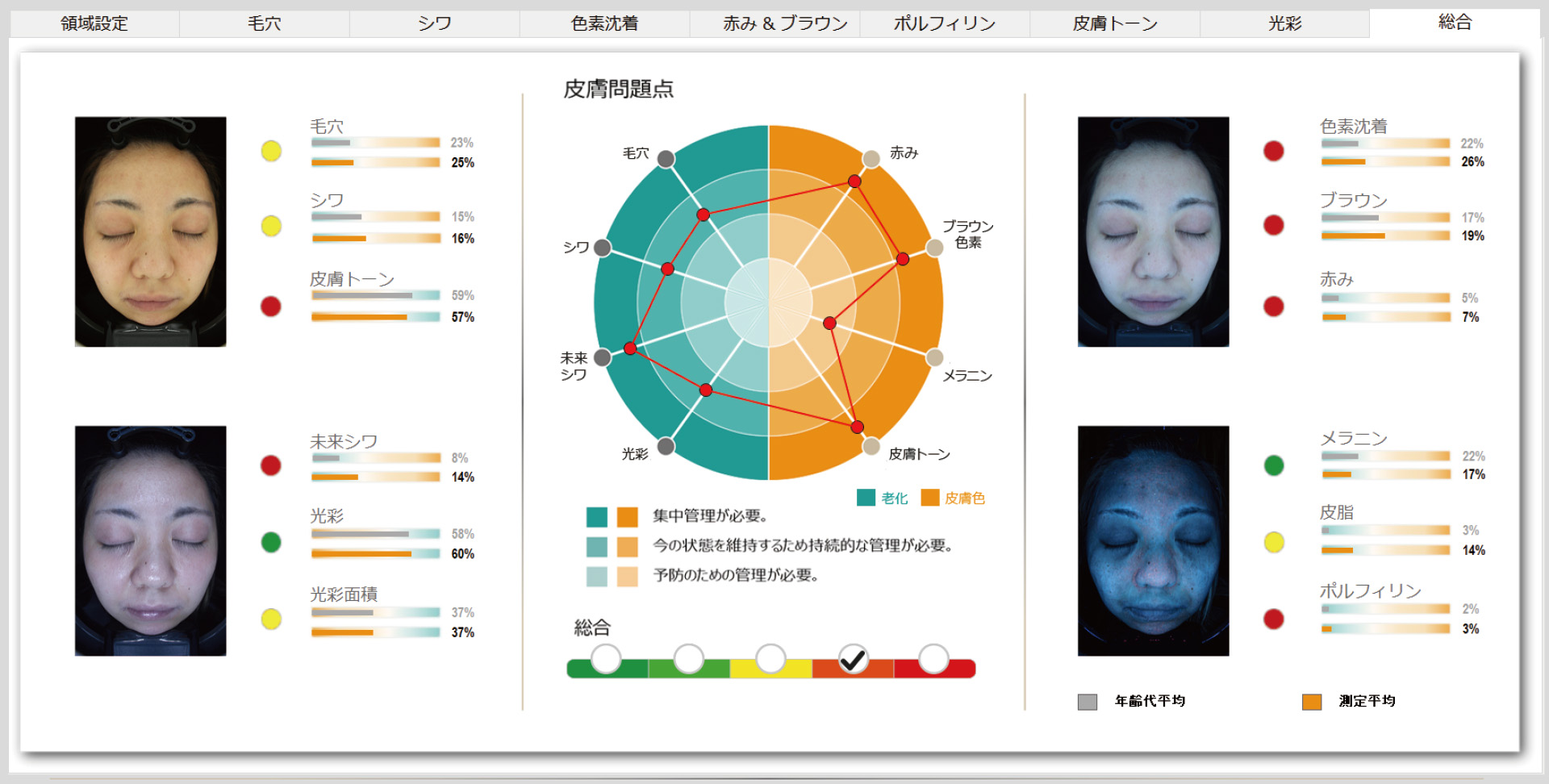 日本製のハイエンドモデル肌分析機で、4種類の光源で撮影した1800万画素の高解像度画像からお肌の状態を詳細に分析し、それぞれの患者様に最適な治療とケアをご提案することが可能です。