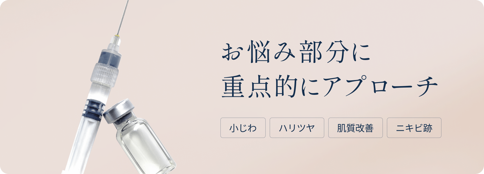 肌育注射とは、「自然な肌質の若返り」を目指した 今大注目の治療です。お悩みやご予算に合わせて製剤を選択し、 お肌に直接浅く注入していく事で、 肌のハリ感やツヤ感、弾力や透明感のアップ、 小じわや毛穴の改善などの効果が期待できます。