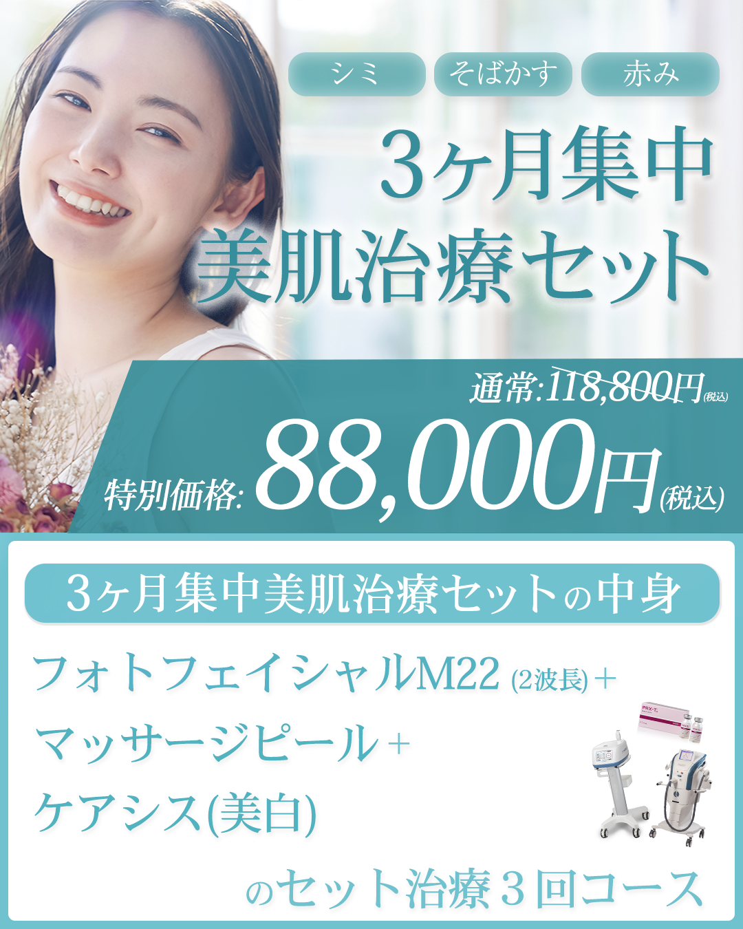フォトフェイシャルM22+マッサージピール+ケアシス美白(レナトスTAプラス)のセット治療3回コース