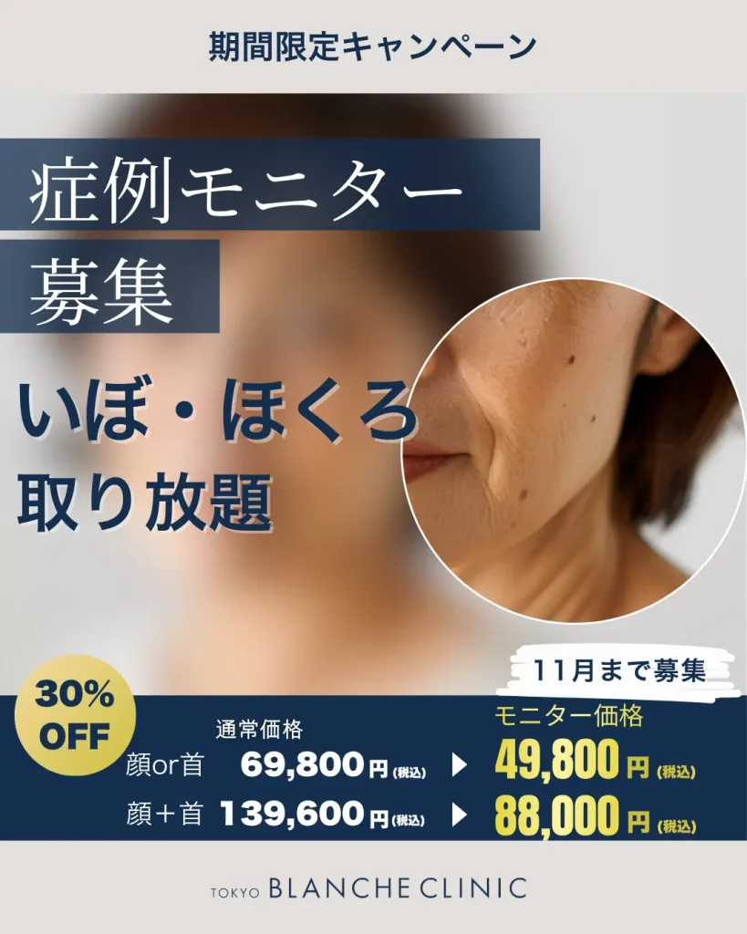 東京ブランシェクリニックでは、いぼ・ほくろ放題のモニターを募集しております。施術前後に撮影にご協力いただける方に限り、顔or首の場合、通常価格69,800円のところ30%OFFの49,800円(税込)でご利用いただけます。※顔と首の両方の場合は、通常価格139,600円のところ88,000円(税込)