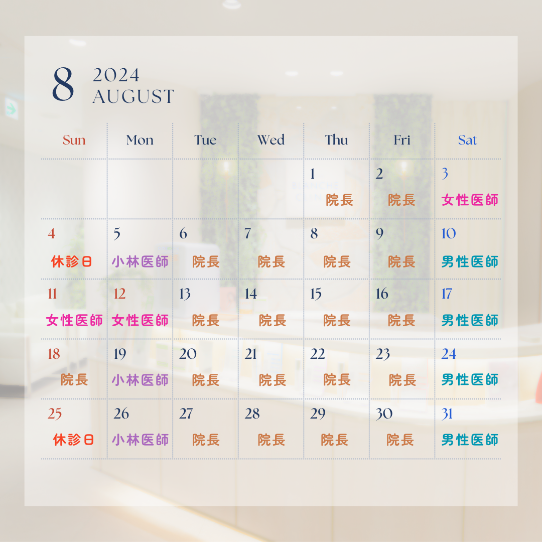 8月営業スケジュール 8月カレンダーです🗓️ 休診日:8/4・25 ※休診日のお電話、LINEチャットでのご予約は承りかねます。 web予約でしたら24時間ご予約可能です♪ 8月実施中のキャンペーンはこちら 今月もみなさまとお会いできることを楽しみにしておます🌻🌻