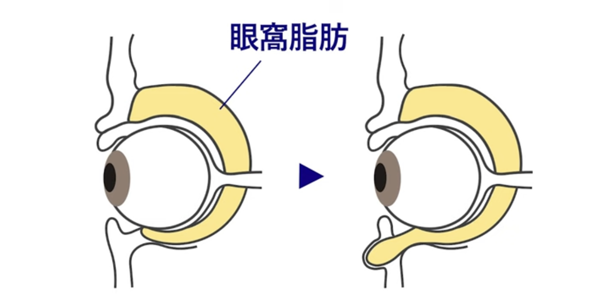 理由はまず、眼球を支えているじん帯が、年齢と共に衰えて支えられなくなり、その結果眼球が少しだけ下がります。下がった眼球に「眼窩脂肪」という小さな脂肪が前に押し出されます。その結果、目の下にふくらみ・たるみができてしまうのです。