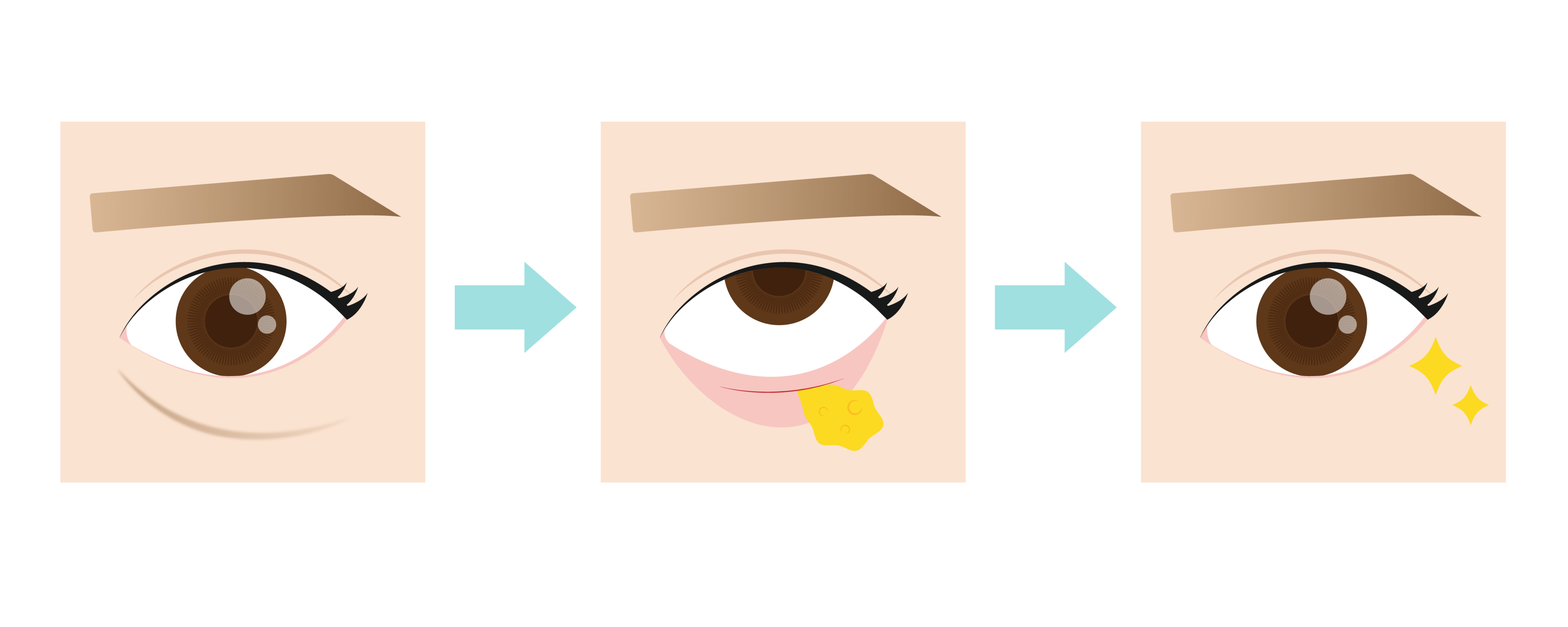 目の下には眼窩脂肪と呼ばれる脂肪があり、この脂肪が原因となります。