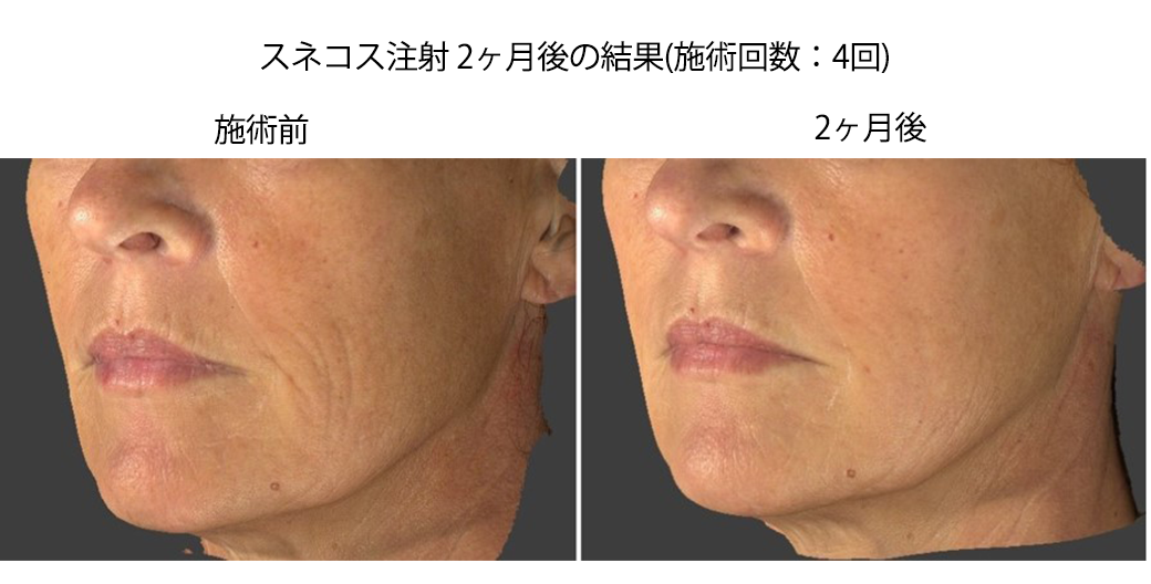 スネコス注射では、筋肉の働きを抑えることはなく、コラーゲンを増やすことでシワの改善をもたらすため、表情が変わることはなく、ナチュラルな仕上がりが期待できます。