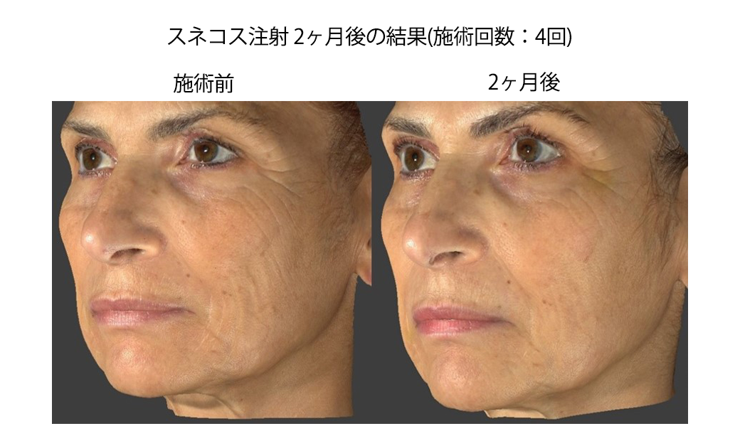 「スネコス注射」は、非架橋のヒアルロン酸と6種類のアミノ酸を特許比率で配合した製剤を真皮層に注入することで、コラーゲン・エラスチンの合成を同時に誘発し、肌の弾力の回復を目指す治療です。