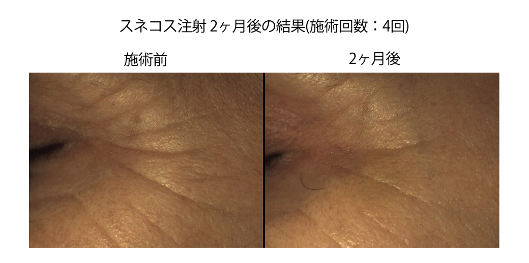 額や目尻の表情じわには、ボトックス注射が有効ですが、併用薬剤との関連でボトックス注射の適応とならない方や、ボトックス注射で起こり得る表情の変化が心配な方には、スネコス注射がおすすめです。