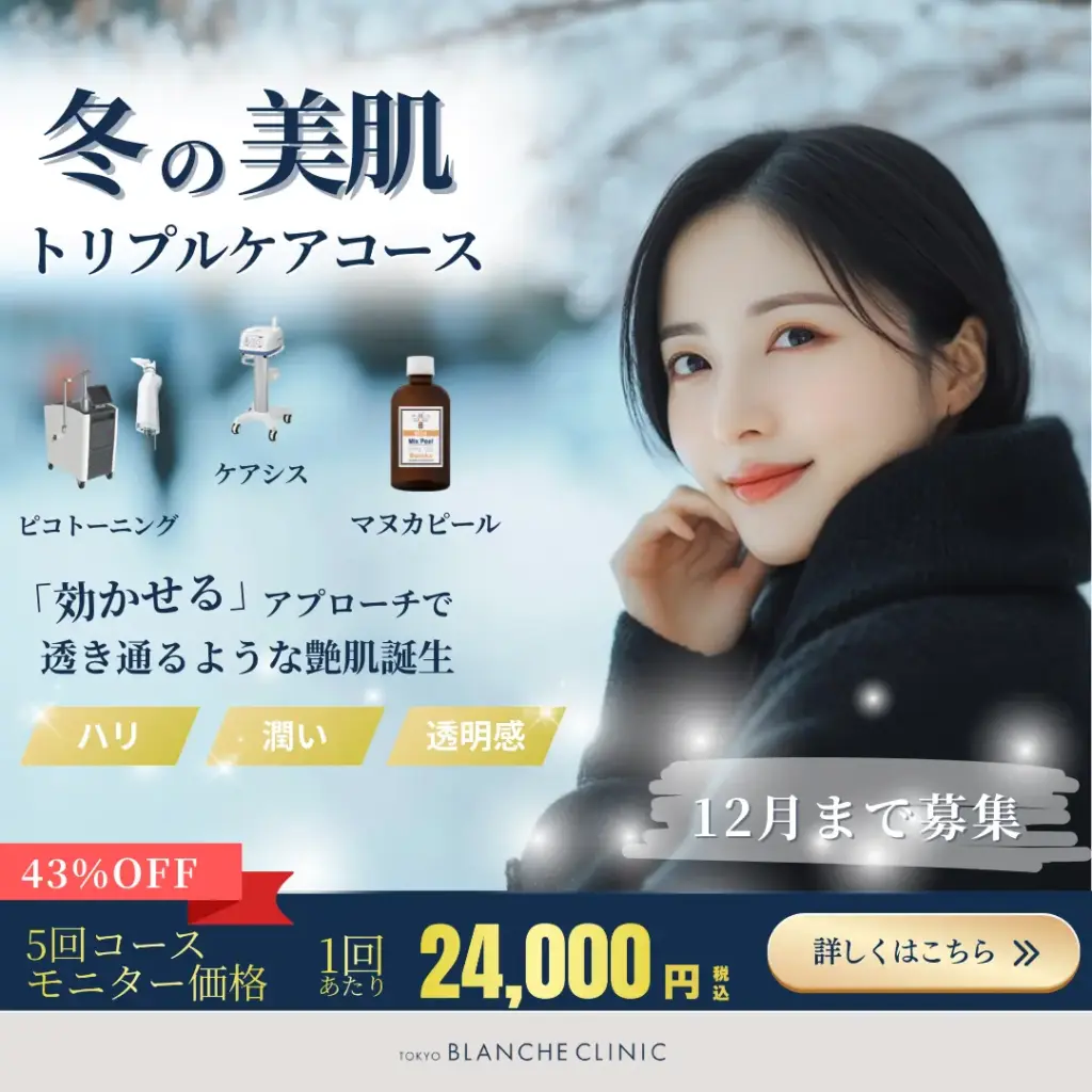 ピコトーニング、ケアシス、マヌカピールの3つの施術を行い、シミやくすみの改善、また保湿、色素沈着の改善まで行うトリプルケア。12月限定で、通常212,000円の所43%OFFの120,000円(1回あたり24,000円)で施術を行うことができます♪