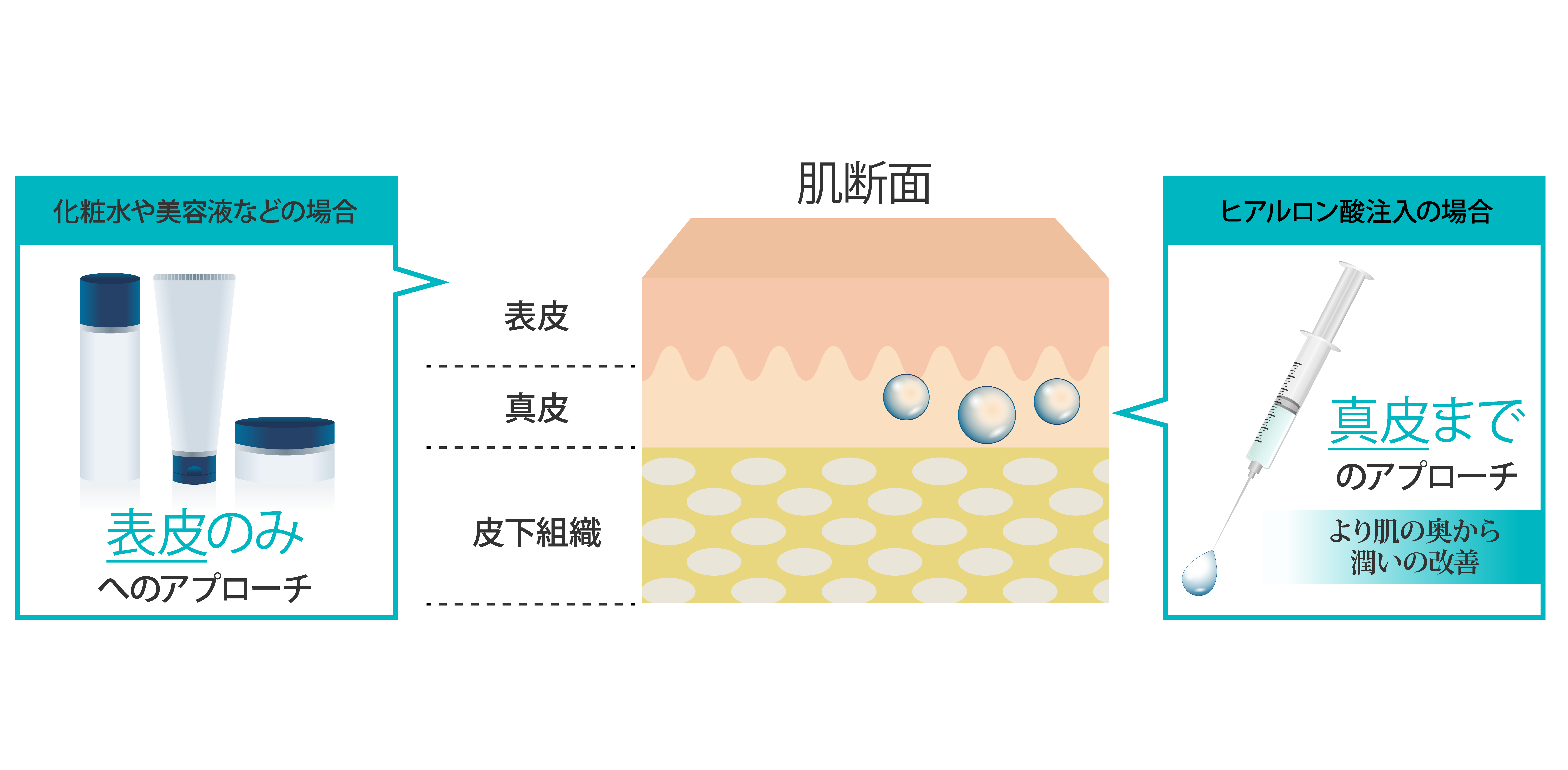 化粧品でヒアルロン酸を補うことは可能です。しかし、一般的にヒアルロン酸を含む化粧品は肌表面に主に作用するため、肌の奥へと浸透することは分子の大きさから難しいとされています。