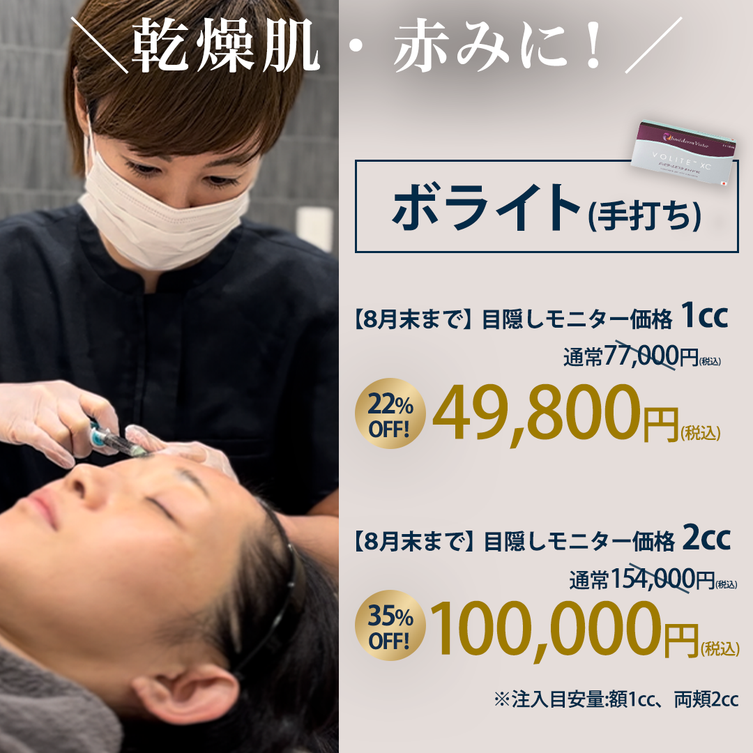 ヒアルロン酸注射には、複数の製剤があります。一般的にヒアルロン酸は、希望とする形に形成したり、ボリュームアップのために利用されることが多いですが、ジュビダームビスタ®ボライトは肌質改善に適応のあるヒアルロン酸です。